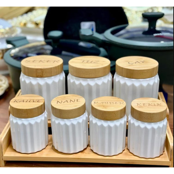 7'Lİ BAMBU KAPAK STANDLI BAHARAT SETİÜrün ÖzellikleriŞık ve doğal tasarımıyla 7'li Bambu Kapak Standlı Baharat Seti, mutfağınıza estetik bir görünüm kazandırır. Seramik gövdesi sağlam ve dayanıklı olup, bambu kapakları sayesinde baharatlarınız uzun süre taze kalır. Pratik standı ile düzenli kullanım sağlar ve mutfakta yerden tasarruf etmenize yardımcı olur. Tuz, şeker, çay, kahve ve çeşitli baharatları saklamak için idealdir. Hava geçirmez kapak yapısı sayesinde nemden korur ve hijyenik bir kullanım sunar.Paket İçeriği1 Adet Ahşap Stand7 Adet Bambu Kapaklı Seramik Baharatlık