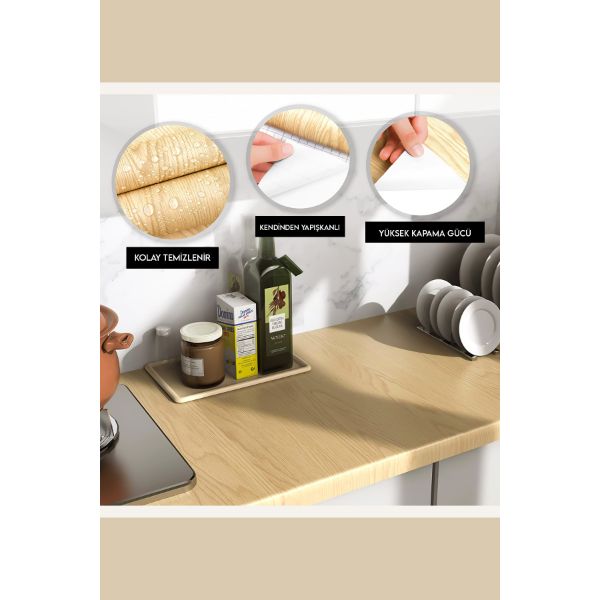 AHŞAP GÖRÜNÜMLÜ KENDİNDEN YAPIŞKANLI KAPLAMA FOLYOSU 5 METRE Ürün Özellikleri Mutfak, banyo dolapları, tezgah, mobilya gibi alanlarda kaplama yapılabilir.Tezgah kullanımında birebir ateşten korunmalı, üzerine sıcak tencere, çaydanlık vs. koymaktan imtina edilmelidir.Üzerinde bıçak ve kesici bir aletler ile kesim yapılmamalıdır, kesim tahtası kullanmanızı öneririz.Kendinden yapışkanlı, silinebilir kaplama folyosu.Üzerinde kesim yapılmamalıdır. Kesim yaparken kesim tahtası kullanılmalıdır.Ateşten korunmalı, üzerine sıcak tencere, çaydanlık vs. koymaktan imtina edilmelidir.Dikkatli kullanım gerektirir.Su, nem ve buhardan etkilenmez.Silinebilir, deterjana karşı dayanıklıdır.Uygulama Yapmaya Başlamadan önce mutlaka uygulama videolarımızı izleyiniz ve dinleyiniz.Kendinden yapışkanlı kaplama folyoları KAĞIT değildir. Sudan etkilenmez.Ürünler uygulandığı koyu zeminin rengini belli etmez, kapatıcı özelliği vardır.Sökmek istediğinizde problem olmaz sökebilirsiniz. Paket İçeriği  1 adet ahşap görünümlü kaplama kağıdıUzunluk: 5 m Genişlik: 60 cm